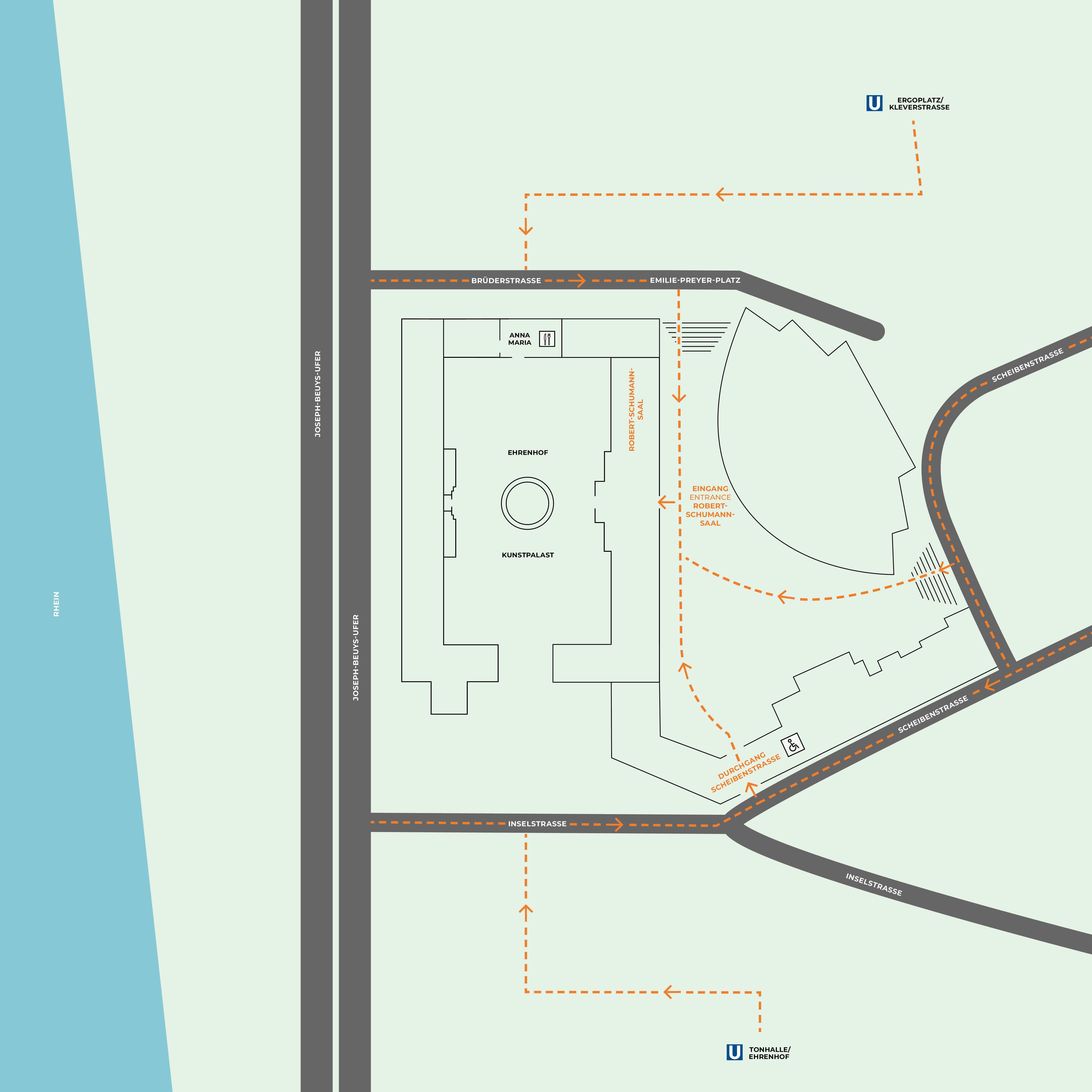 Bei Veranstaltungen kann weiterhin der direkte, unterirdische Zugang im Parkhaus „Campus am Kunstpalast“ im 1. Untergeschoss genutzt werden.